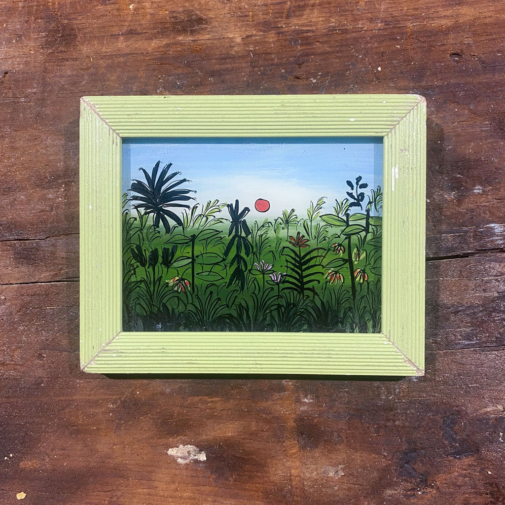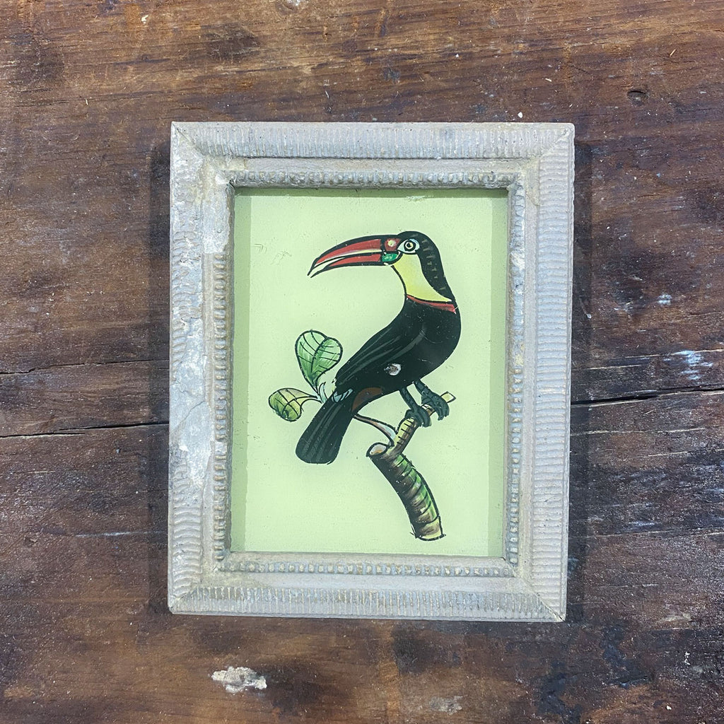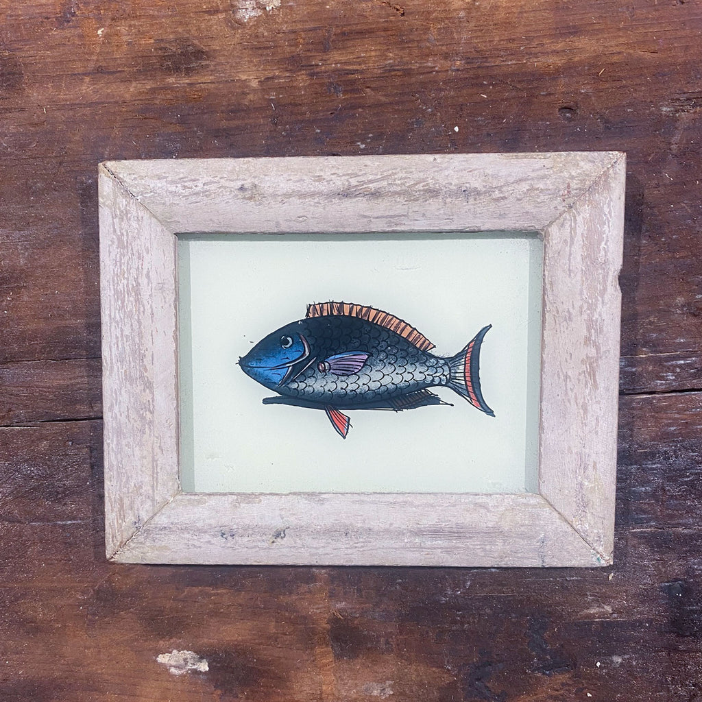 These gorgeous and playful glass paintings are hand-painted in India, each radiating a quirky charm. They come framed with reclaimed, handmade frames, adding a touch of sustainability and uniqueness to their character.