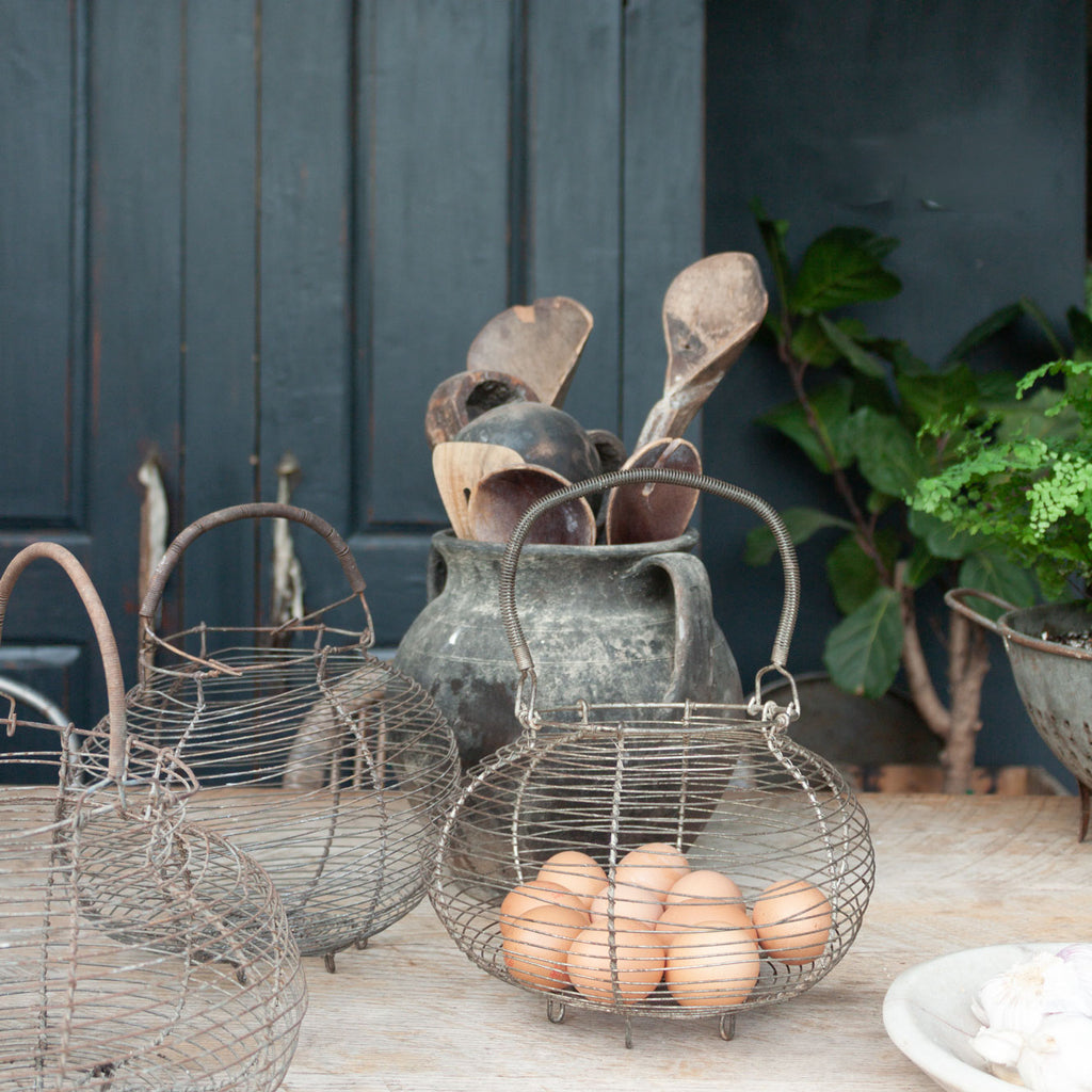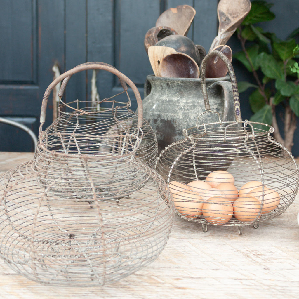 Authentic vintage French wire egg basket, originally used on rural farms to collect and transport eggs and small produce. Crafted from durable galvanized wire, each basket shows the charming patina of decades of use.