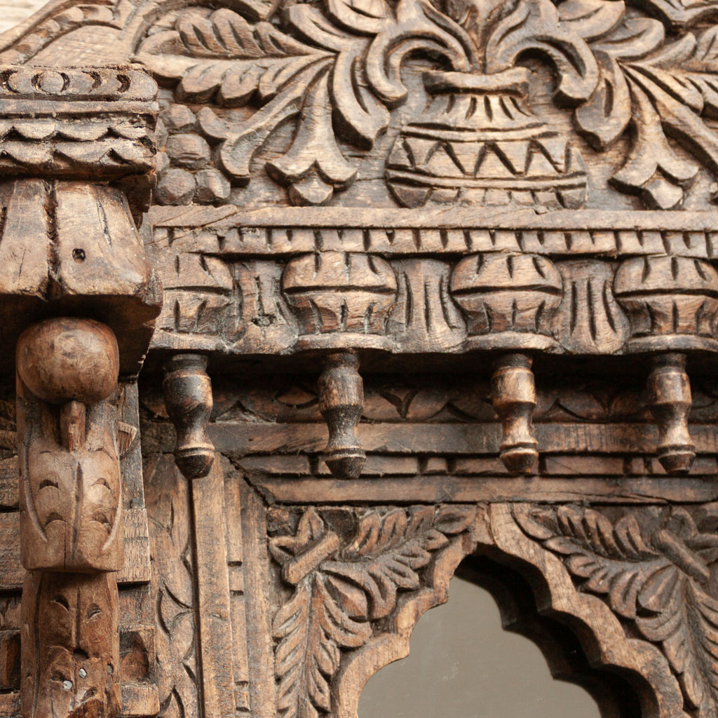 Over time, the wood has developed a beautiful patina, and the wear on the surface adds character and authenticity. The small mirror at the center is framed by the exquisite carved surround, which is the highlight of this piece. Its detailed, worn carvings tell a story of history and artistry, making it highly collectible for lovers of vintage Indian decor.